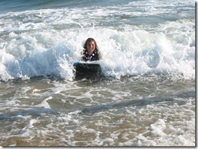 I rode a few good waves in honor of Jill and Clare and Sprogblogger as they were all waxing poetic in comments about playing in the waves. I didn’t bring my Nikon to the beach (too much sand) but I did use my little compact camera. I think I snapped a couple of good photos. Enjoy a day playing in the Pacific Ocean with us!